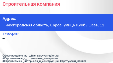 Строительная компания по адресу Нижегородская область, Саров, улица Куйбышева, 11 в дальнейшем Организация, размещена в следующих категориях: