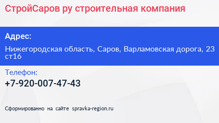 СтройСаров.ру, строительная компания по адресу Нижегородская область, Саров, Варламовская дорога, 23 ст16 в дальнейшем Организация, размещена в следующих категориях: