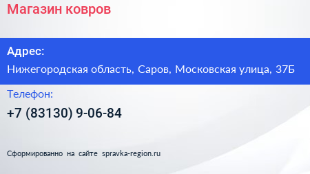 Магазин ковров по адресу Нижегородская область, Саров, Московская улица, 37Б в дальнейшем Организация, размещена в следующих категориях: