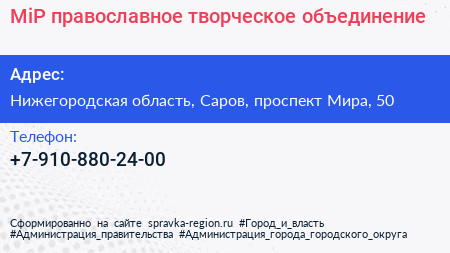 МiР, православное творческое объединение по адресу Нижегородская область, Саров, проспект Мира, 50 в дальнейшем Организация, размещена в следующих категориях: