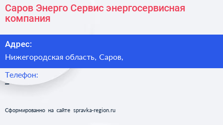 Саров Энерго Сервис, энергосервисная компания по адресу Нижегородская область, Саров, в дальнейшем Организация, размещена в следующих категориях: