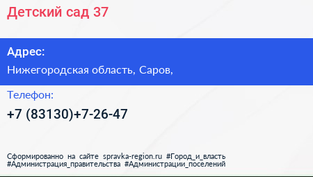 Детский сад №37 по адресу Нижегородская область, Саров, в дальнейшем Организация, размещена в следующих категориях: