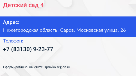 Детский сад №4 по адресу Нижегородская область, Саров, Московская улица, 26 в дальнейшем Организация, размещена в следующих категориях:
