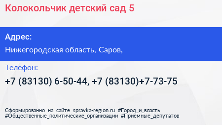Колокольчик, детский сад №5 по адресу Нижегородская область, Саров, в дальнейшем Организация, размещена в следующих категориях: