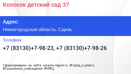 Колосок, детский сад №37 по адресу Нижегородская область, Саров, в дальнейшем Организация, размещена в следующих категориях: