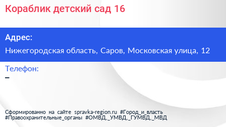 Кораблик, детский сад №16 по адресу Нижегородская область, Саров, Московская улица, 12 в дальнейшем Организация, размещена в следующих категориях: