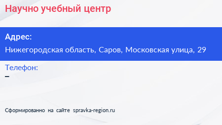 Научно-учебный центр по адресу Нижегородская область, Саров, Московская улица, 29 в дальнейшем Организация, размещена в следующих категориях: