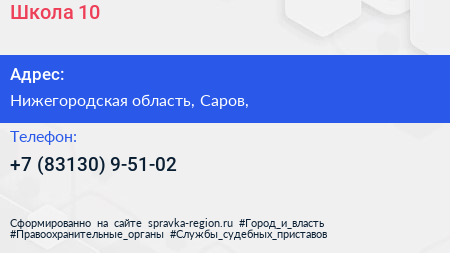 Школа №10 по адресу Нижегородская область, Саров, в дальнейшем Организация, размещена в следующих категориях: