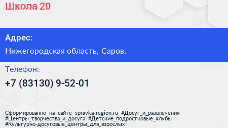 Школа №20 по адресу Нижегородская область, Саров, в дальнейшем Организация, размещена в следующих категориях:
