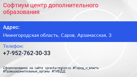 Софтиум, центр дополнительного образования по адресу Нижегородская область, Саров, Арзамасская, 3 в дальнейшем Организация, размещена в следующих категориях: