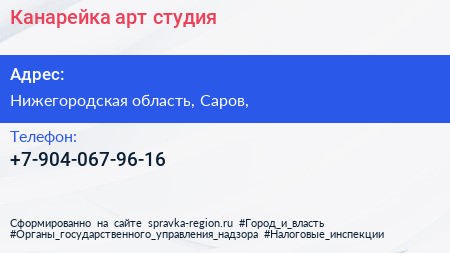 Канарейка, арт-студия по адресу Нижегородская область, Саров, в дальнейшем Организация, размещена в следующих категориях: