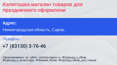 Капитошка, магазин товаров для праздничного оформлени по адресу Нижегородская область, Саров, в дальнейшем Организация, размещена в следующих категориях: