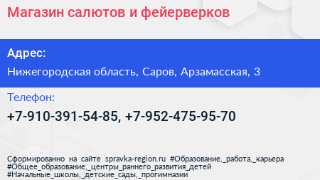 Магазин салютов и фейерверков по адресу Нижегородская область, Саров, Арзамасская, 3 в дальнейшем Организация, размещена в следующих категориях: