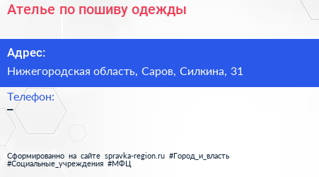 Ателье по пошиву одежды по адресу Нижегородская область, Саров, Силкина, 31 в дальнейшем Организация, размещена в следующих категориях: