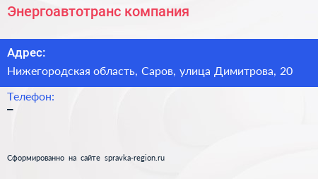 Энергоавтотранс, компания по адресу Нижегородская область, Саров, улица Димитрова, 20 в дальнейшем Организация, размещена в следующих категориях: