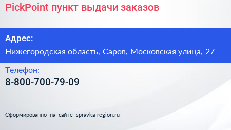 PickPoint, пункт выдачи заказов по адресу Нижегородская область, Саров, Московская улица, 27 в дальнейшем Организация, размещена в следующих категориях: