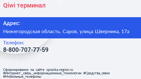 Qiwi, терминал по адресу Нижегородская область, Саров, улица Шверника, 17а в дальнейшем Организация, размещена в следующих категориях: