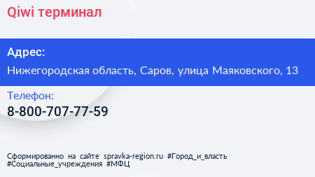 Qiwi, терминал по адресу Нижегородская область, Саров, улица Маяковского, 13 в дальнейшем Организация, размещена в следующих категориях: