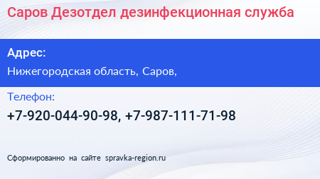 Саров Дезотдел, дезинфекционная служба по адресу Нижегородская область, Саров, в дальнейшем Организация, размещена в следующих категориях: