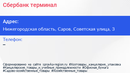 Сбербанк, терминал по адресу Нижегородская область, Саров, Советская улица, 3 в дальнейшем Организация, размещена в следующих категориях: