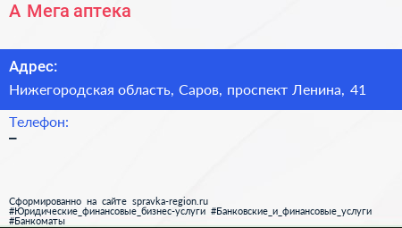 А-Мега, аптека по адресу Нижегородская область, Саров, проспект Ленина, 41 в дальнейшем Организация, размещена в следующих категориях: