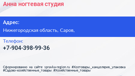 Анна, ногтевая студия по адресу Нижегородская область, Саров, в дальнейшем Организация, размещена в следующих категориях: