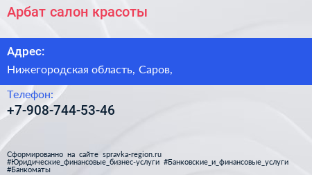 Арбат, салон красоты по адресу Нижегородская область, Саров, в дальнейшем Организация, размещена в следующих категориях: