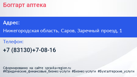Боггарт, аптека по адресу Нижегородская область, Саров, Заречный проезд, 1 в дальнейшем Организация, размещена в следующих категориях: