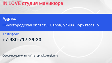 IN LOVE, студия маникюра по адресу Нижегородская область, Саров, улица Курчатова, 6 в дальнейшем Организация, размещена в следующих категориях: