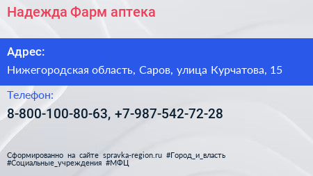 Надежда-Фарм, аптека по адресу Нижегородская область, Саров, улица Курчатова, 15 в дальнейшем Организация, размещена в следующих категориях: