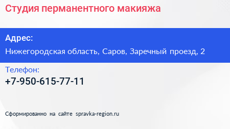 Студия перманентного макияжа по адресу Нижегородская область, Саров, Заречный проезд, 2 в дальнейшем Организация, размещена в следующих категориях:
