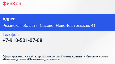 ФинКон по адресу Рязанская область, Сасово, Ново-Елатомская, 41 в дальнейшем Организация, размещена в следующих категориях: