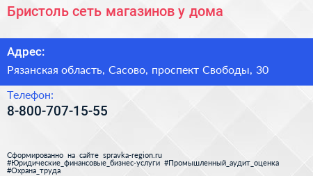 Бристоль, сеть магазинов у дома по адресу Рязанская область, Сасово, проспект Свободы, 30 в дальнейшем Организация, размещена в следующих категориях: