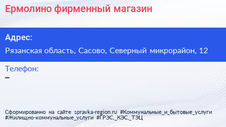 Ермолино, фирменный магазин по адресу Рязанская область, Сасово, Северный микрорайон, 12 в дальнейшем Организация, размещена в следующих категориях:
