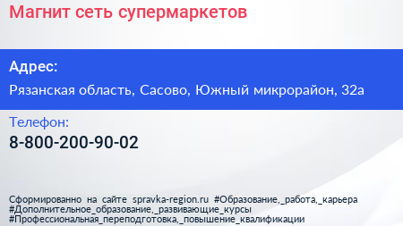 Магнит, сеть супермаркетов по адресу Рязанская область, Сасово, Южный микрорайон, 32а в дальнейшем Организация, размещена в следующих категориях: