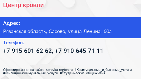 Центр кровли по адресу Рязанская область, Сасово, улица Ленина, 60а в дальнейшем Организация, размещена в следующих категориях: