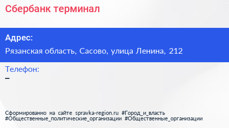 Сбербанк, терминал по адресу Рязанская область, Сасово, улица Ленина, 212 в дальнейшем Организация, размещена в следующих категориях: