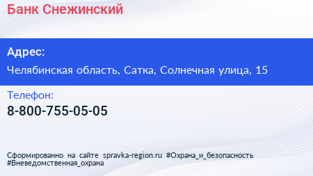 Банк Снежинский по адресу Челябинская область, Сатка, Солнечная улица, 15 в дальнейшем Организация, размещена в следующих категориях: