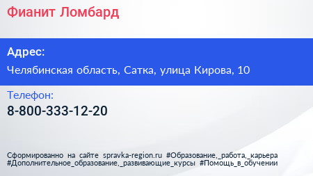 Фианит-Ломбард по адресу Челябинская область, Сатка, улица Кирова, 10 в дальнейшем Организация, размещена в следующих категориях: