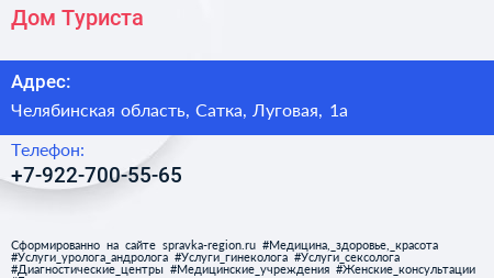 Дом Туриста по адресу Челябинская область, Сатка, Луговая, 1а в дальнейшем Организация, размещена в следующих категориях: