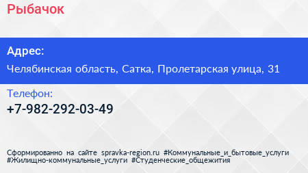 Рыбачок по адресу Челябинская область, Сатка, Пролетарская улица, 31 в дальнейшем Организация, размещена в следующих категориях: