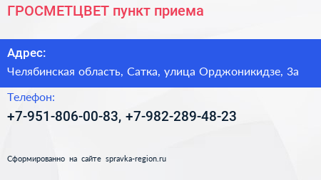 ГРОСМЕТЦВЕТ, пункт приема по адресу Челябинская область, Сатка, улица Орджоникидзе, 3а в дальнейшем Организация, размещена в следующих категориях: