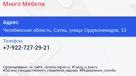 Много Мебели по адресу Челябинская область, Сатка, улица Орджоникидзе, 13 в дальнейшем Организация, размещена в следующих категориях: