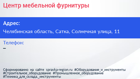 Центр мебельной фурнитуры по адресу Челябинская область, Сатка, Солнечная улица, 11 в дальнейшем Организация, размещена в следующих категориях:
