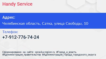 Handy Service по адресу Челябинская область, Сатка, улица Свободы, 10 в дальнейшем Организация, размещена в следующих категориях: