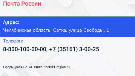 Почта России по адресу Челябинская область, Сатка, улица Свободы, 1 в дальнейшем Организация, размещена в следующих категориях:
