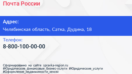 Почта России по адресу Челябинская область, Сатка, Дудина, 18 в дальнейшем Организация, размещена в следующих категориях:
