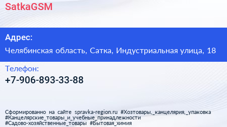 SatkaGSM по адресу Челябинская область, Сатка, Индустриальная улица, 18 в дальнейшем Организация, размещена в следующих категориях: