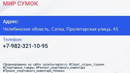 МИР СУМОК по адресу Челябинская область, Сатка, Пролетарская улица, 41 в дальнейшем Организация, размещена в следующих категориях:
