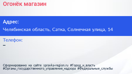 Огонёк, магазин по адресу Челябинская область, Сатка, Солнечная улица, 14 в дальнейшем Организация, размещена в следующих категориях: